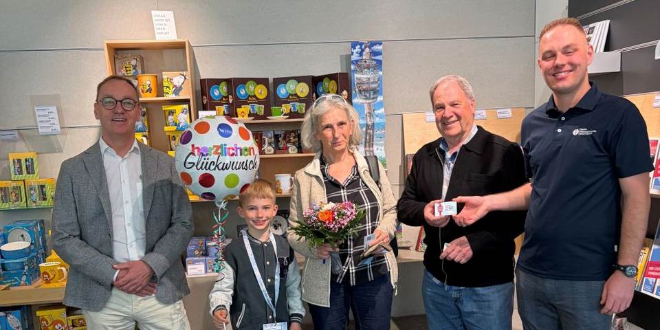 Der glückliche Rekordgast Rolf H. aus Renningen wurde am Nachmittag gemeinsam mit seiner Familie herzlich vom Team des SWR Fernsehturms empfangen. Als Überraschung erhielt er neben einem Blumenstrauß und einem Glückwunschballon auch eine Jahreskarte, die ihm beliebig viele Auffahrten auf den Turm ermöglicht.