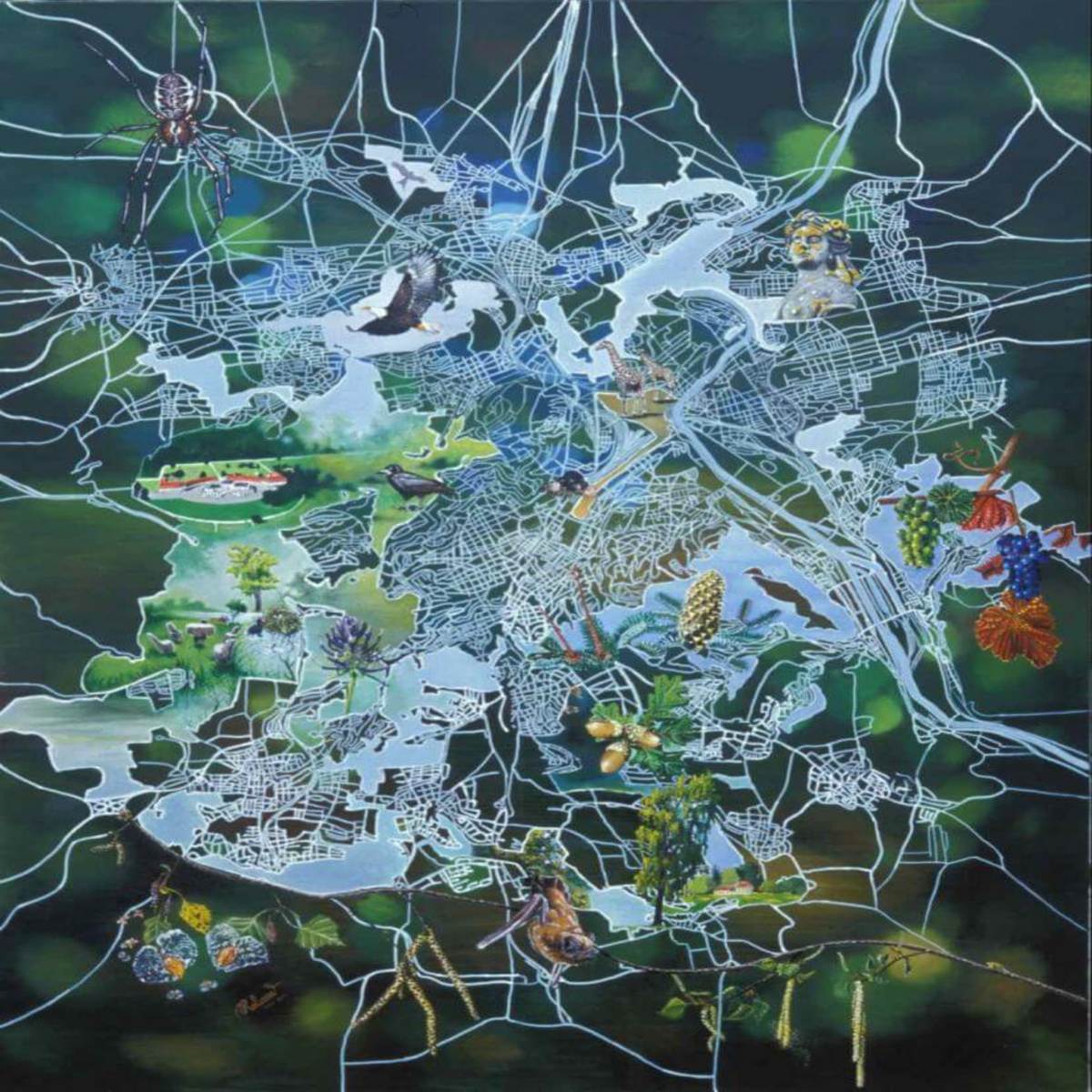 Der Rot-Milan (Milvus milvus) und die Hänge-Birke (Betula pendula, im Verlauf der A 8) als Vogel bzw. Baum des Jahres 2000, stehen für das Jahr, in dem das Gemälde vollendet wurde. Die zu Spinnfäden gewordenen Straßen symbolisieren die Vernetzung der Stadtbiotope. Ein Maulwurf bezieht Stellung, um das Bahnprojekt „Stuttgart 21“ entweder zu realisieren oder zu untergraben.