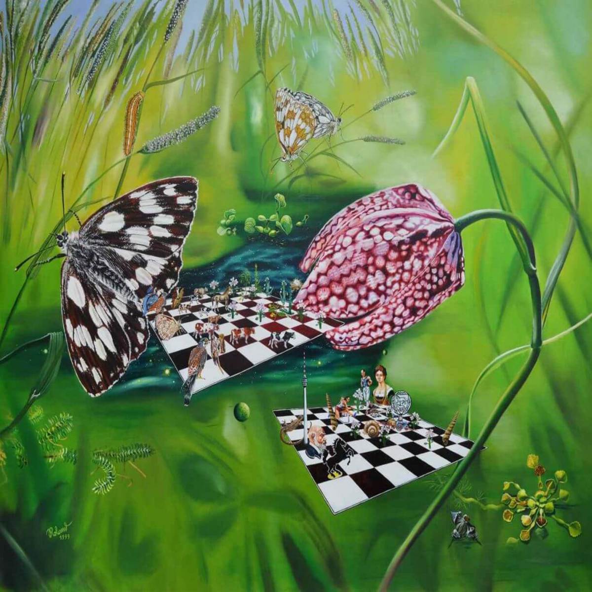 In dieser Partie spielen Tiere gegen Pflanzen. Jedes dargestellte Wesen enthält in seinem deutschen Namen die entsprechende Schachfigur, die es verkörpert. Das Spiel zeigt einen Ausschnitt aus der WM-Begegnung Kasparow gegen Karpow vom 08.10.1986, die damals mit einem Remis endete. In der Natur hat sich also ein Gleichgewicht unter den Lebewesen herausgebildet. Auf dem zweiten Brett spielen Tiere und Pflanzen gemeinsam gegen den Menschen und seine technischen und kulturellen Errungenschaften.