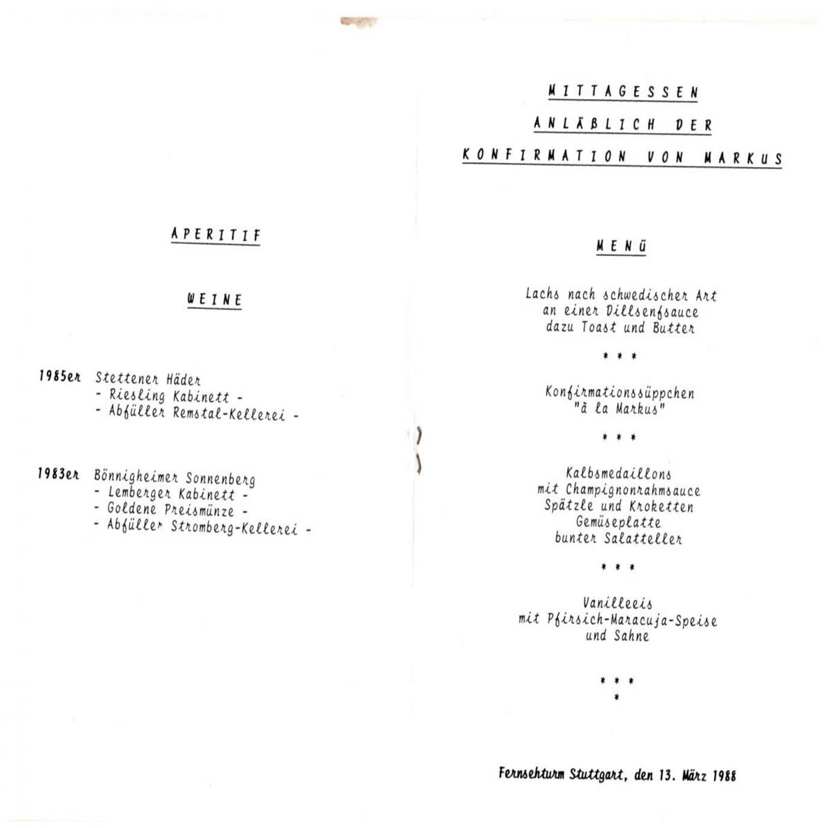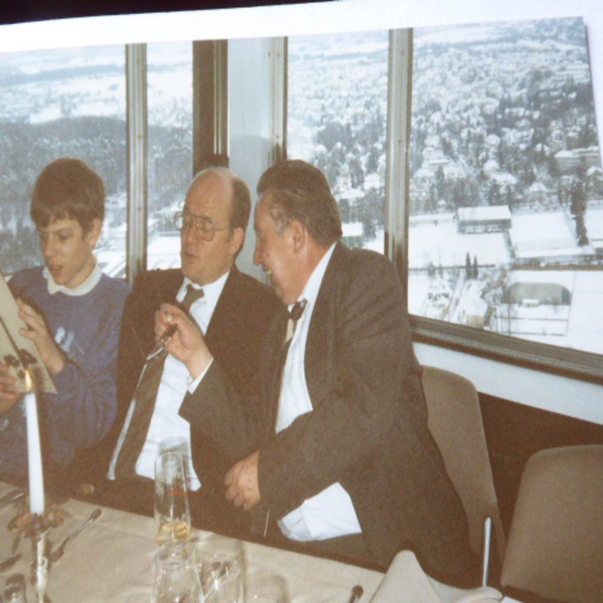 Am Konfirmationstag selbst dann die Überraschung: In der Nacht hatte es heftig geschneit und schneite immer noch: Garten, Straßen – alles war schneebedeckt, Viele Fahrzeuge blieben im Schnee stecken und manche Gäste konnten leider nicht pünktlich am Gottesdienst teilnehmen. Dafür stand bei unserer Rückkehr ein riesiger Schneemann vor dem Gartentor. Danach wurde die ganze Familie in Autos gepackt und zum Fernsehturm gefahren. Auch dort herrschte noch Chaos, bevor wir auf den Parkplatz einbiegen konnten. Jede Menge Räumfahrzeuge, Unimogs usw. waren im Einsatz, um die Schneemassen zu beseitigen. Anschließend ging alles sehr schnell: Die Tickets zur Auffahrt waren gelöst, und wir konnten ein wunderbares Wintermärchen vom Restaurant aus genießen. Die Aussicht auf die verschneite Stadt und die Wälder bis ins Neckartal, vom Rotenberg, nach Sillenbuch und von der Schwäbischen Alb bis zu den Waldau-Sportplätzen, alles war wie verzaubert. Die Tische waren wunderbar gedeckt und die Speisen köstlich. Für den Konfirmanden gab es ein eigens kreiertes Festtagssüppchen und der Patenonkel hatte sogar einen selbst gedrehten Miniatur-Fernsehturm mitgebracht. Einige von uns wagten es, dem Wintersturm auf der Dachterrasse zu trotzen. So haben wir einige wundervolle festliche Stunden dort oben verbracht und konnten das faszinierende Ambiente genießen."